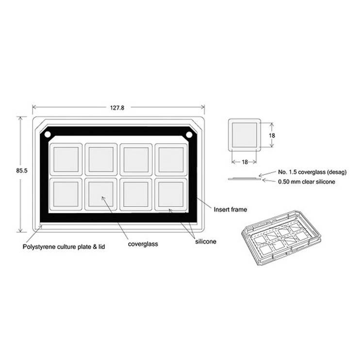 Sterile, ready-to-use MultiSlip for culture of cells where pretreatment with a biological coating of glass surface is required. MultiSlip insert with 8 (18mm x 18mm) or 15 (12mm x 12mm) No.1.5 thickness, German coverglass per insert are sterile and ready to use in conventional 86mm x 128mm culture plates.