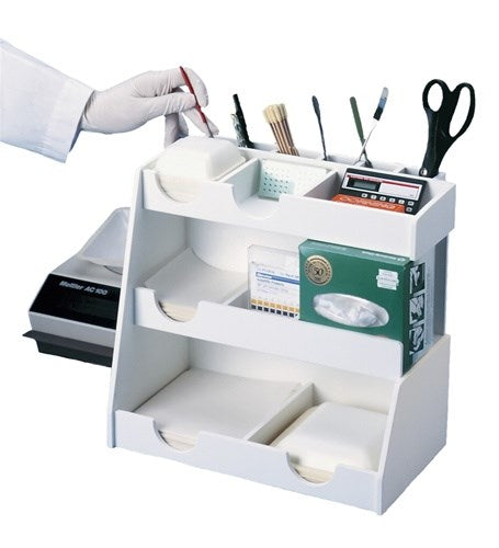 These organisers protect, store and dispense expensive weighing supplies. This workstation is designed to eliminate clutter around scales and balances, protecting weighing papers, weighing boats, spatulas and more. Constructed from lightweight chemically resistant white PVC. Fits neatly on a lab bench or counter.